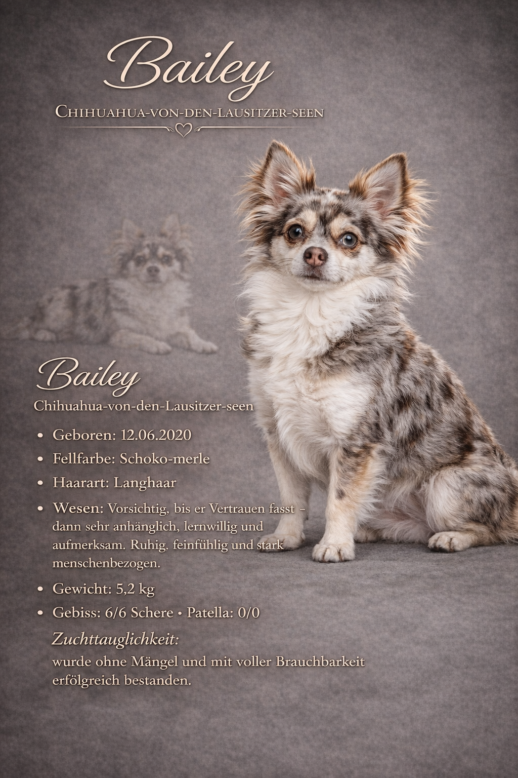 Mit seiner sanften Art, seiner großen Lernfreude und seinem feinen Gespür für die Bedürfnisse des Rudels ist Bailey eine liebevolle Persönlichkeit. Er bereichert unser Zusammenleben jeden Tag und gibt dem Rudel auf seine ruhige Weise Halt und Orientierung.